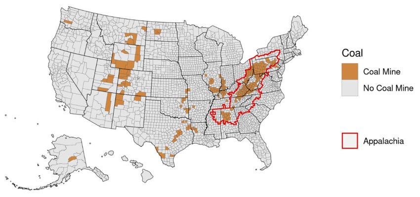No mapa abaixo, contornadas em vermelho, vemos as Montanhas Apalache, e as regiões de mineração de carvão nos Estados Unidos em marrom: