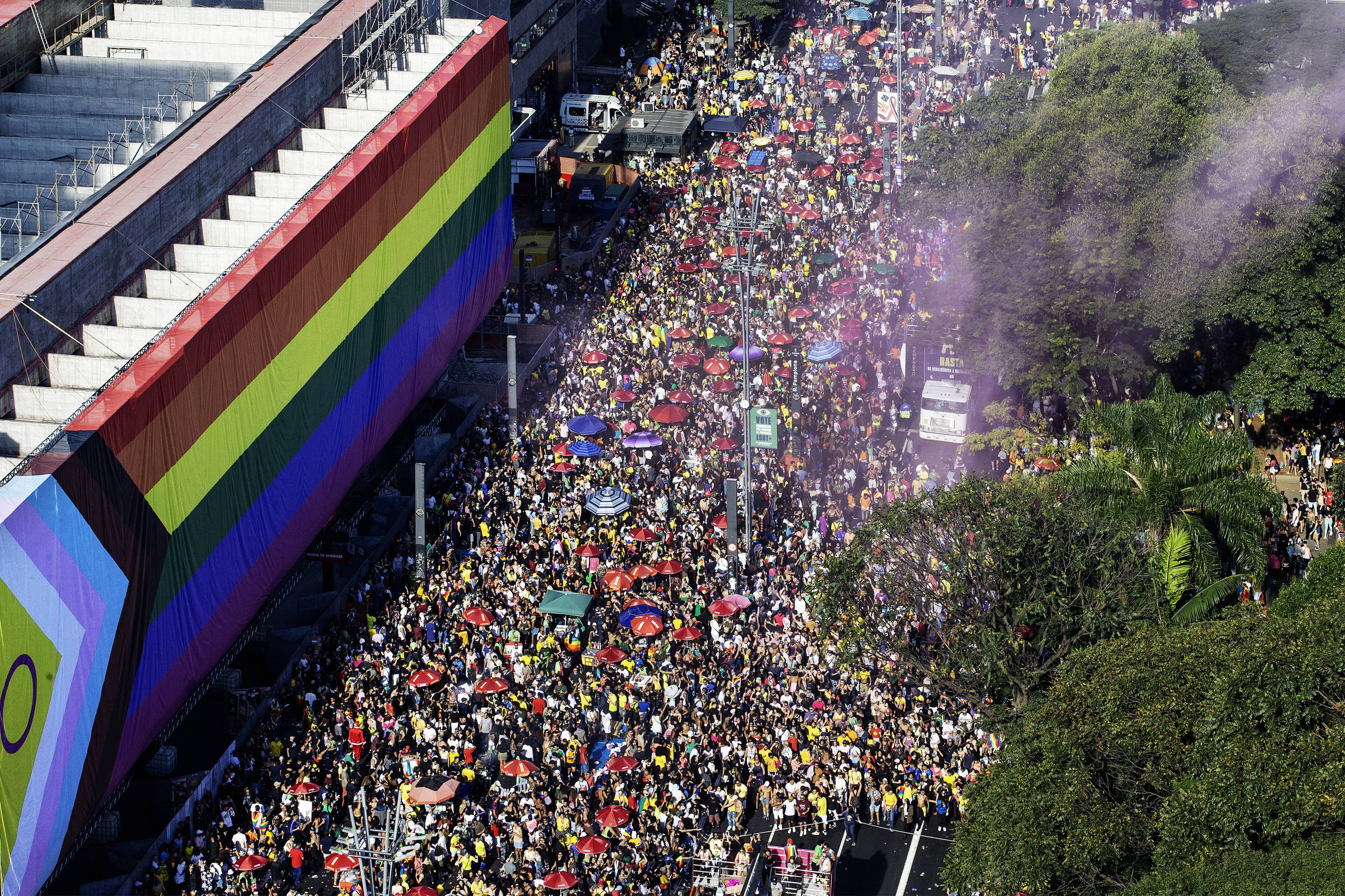 Todos os anos temos presença marcada de celebridades brasileiras — aliadas da causa ou parte da comunidade — entre o público. Só no ano passado, por exemplo, tivemos nomes como Pabllo Vittar (São Amores e Alibi), Sandra Sá (Retratos e Canções) e Glória Groove (Nosso Primeiro Beijo) em cima dos trios elétricos, além de nomes como o da atriz e apresentadora Adriane Galisteu, do ator Tiago Abravanel e da influenciadora Blogueirinha entre os presentes.