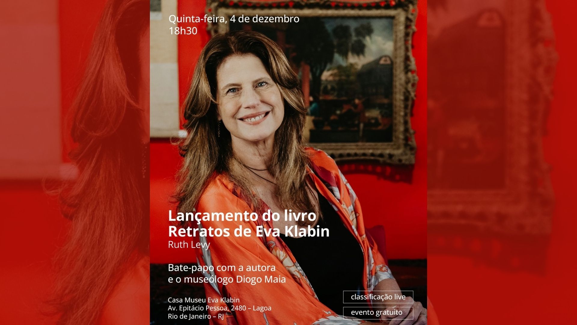 O evento de lançamento do livro Retratos de Eva Kablin será quinta-feira, 4 de dezembro, às 18h30, na Casa Museu Eva Klabin. A autora do livro, assim como o museólogo Diogo Maia, irão participar de um bate-papo seguido de coquetel e sessão de autógrafos, às 19h30. O livro estará à venda na Casa Museu e na Livraria da Travessa.